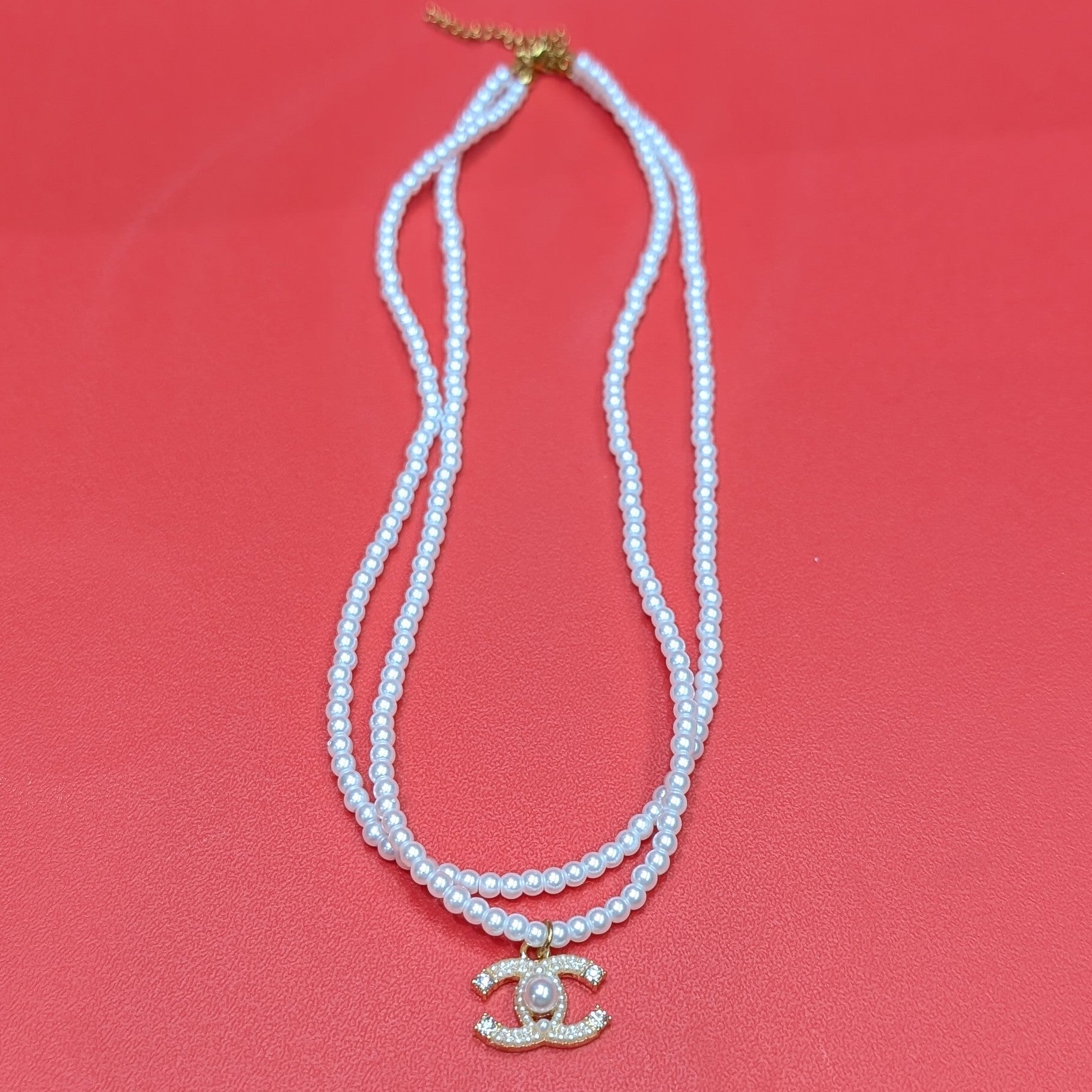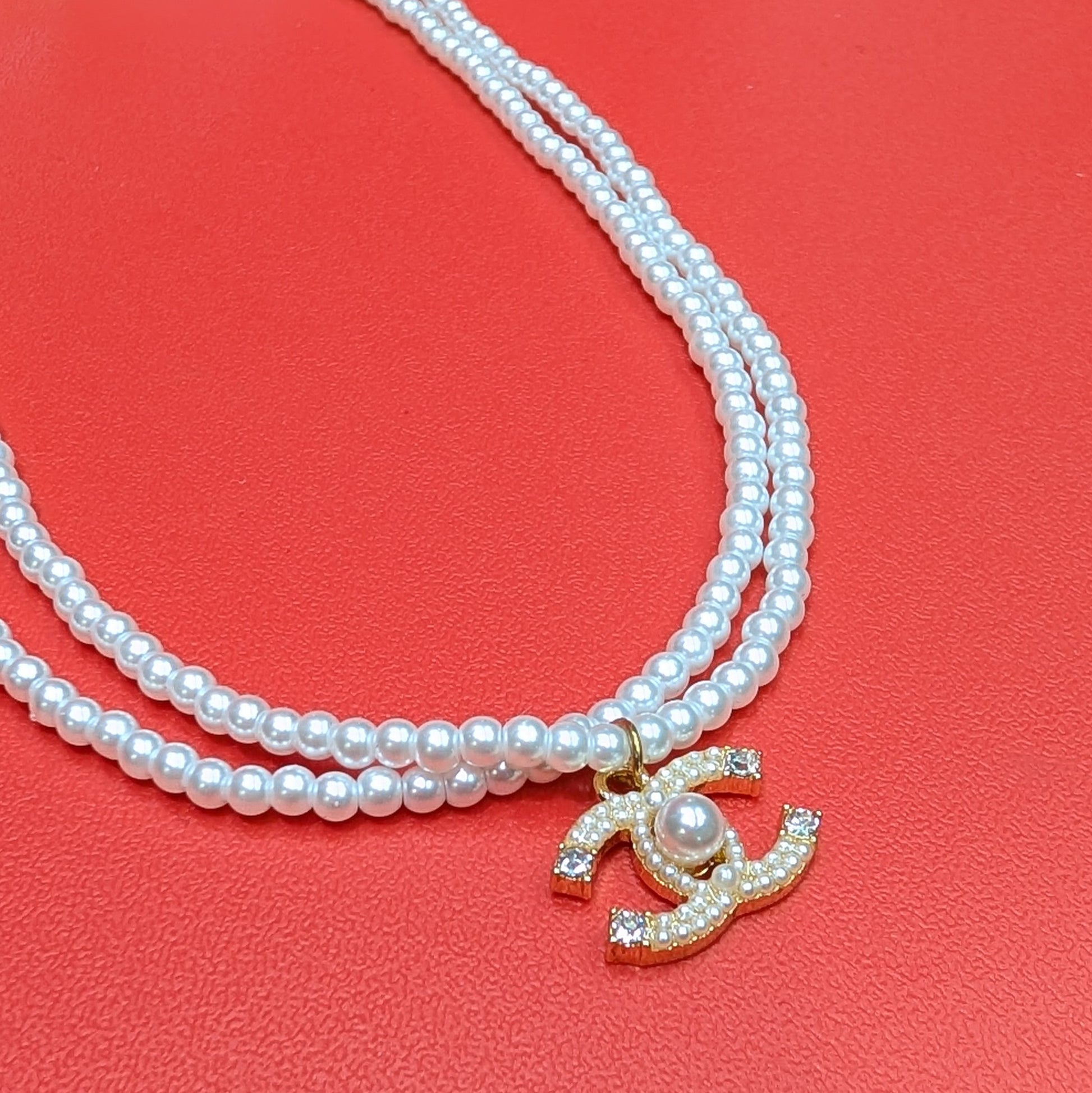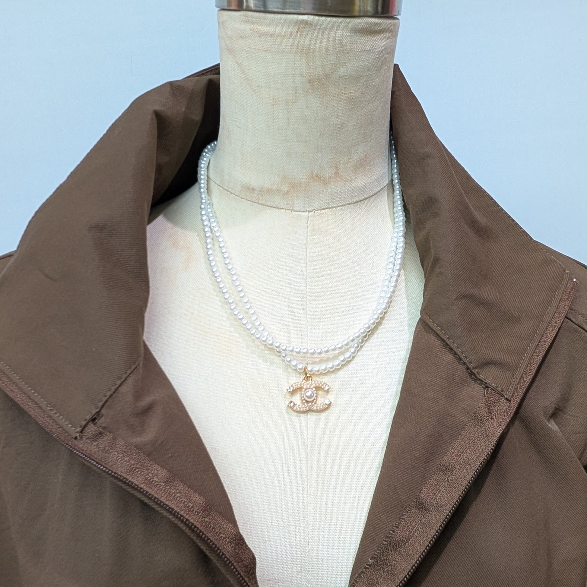 小粒パールの2連に素敵なCCマークチャームが付いたネックレスです。