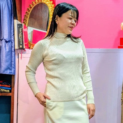 さらっと伸びがよく、ボディラインを拾いづらいハイネックニットです。