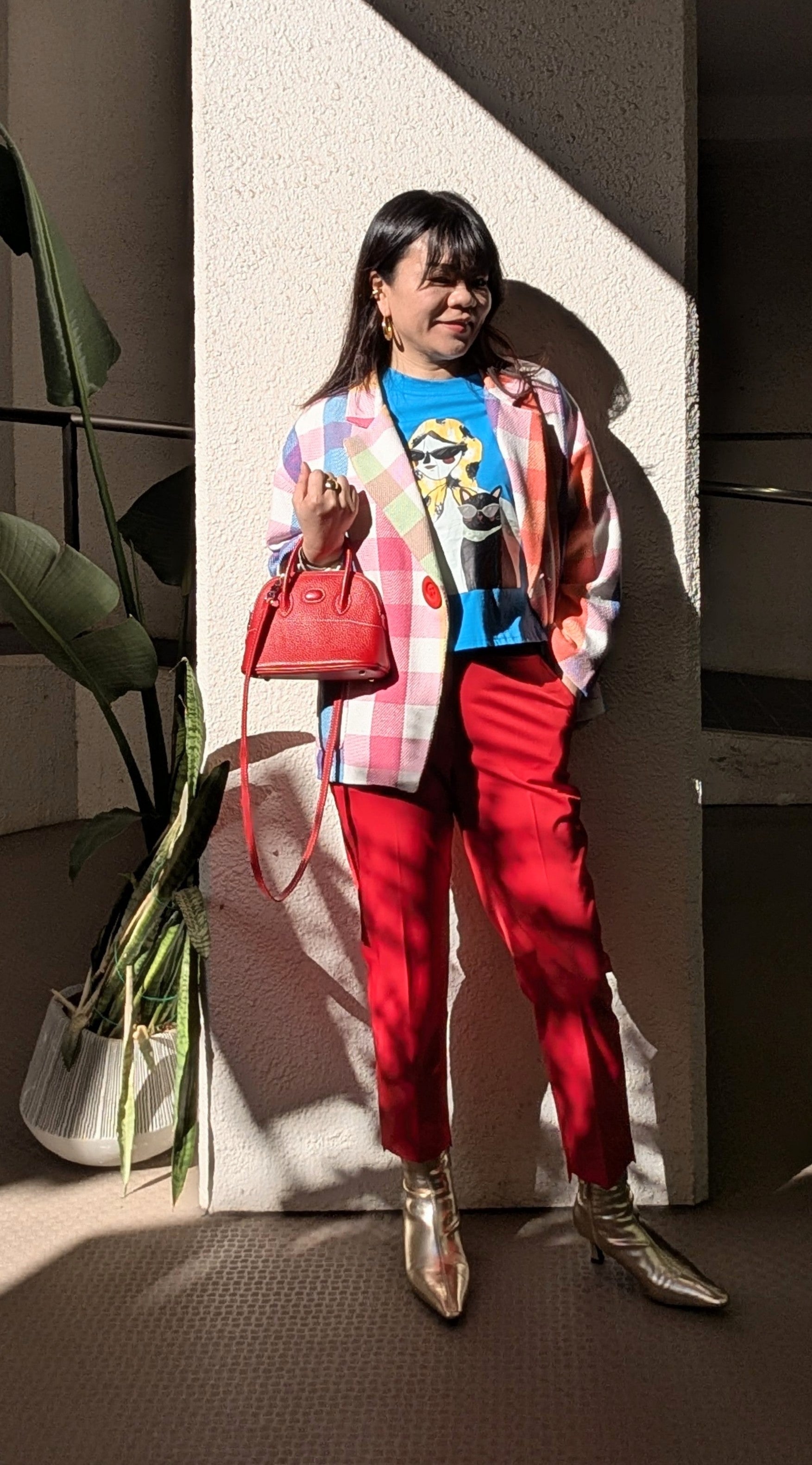 フロントの赤いボタンは飾りとなり裏ボタンで留めるデザイン。