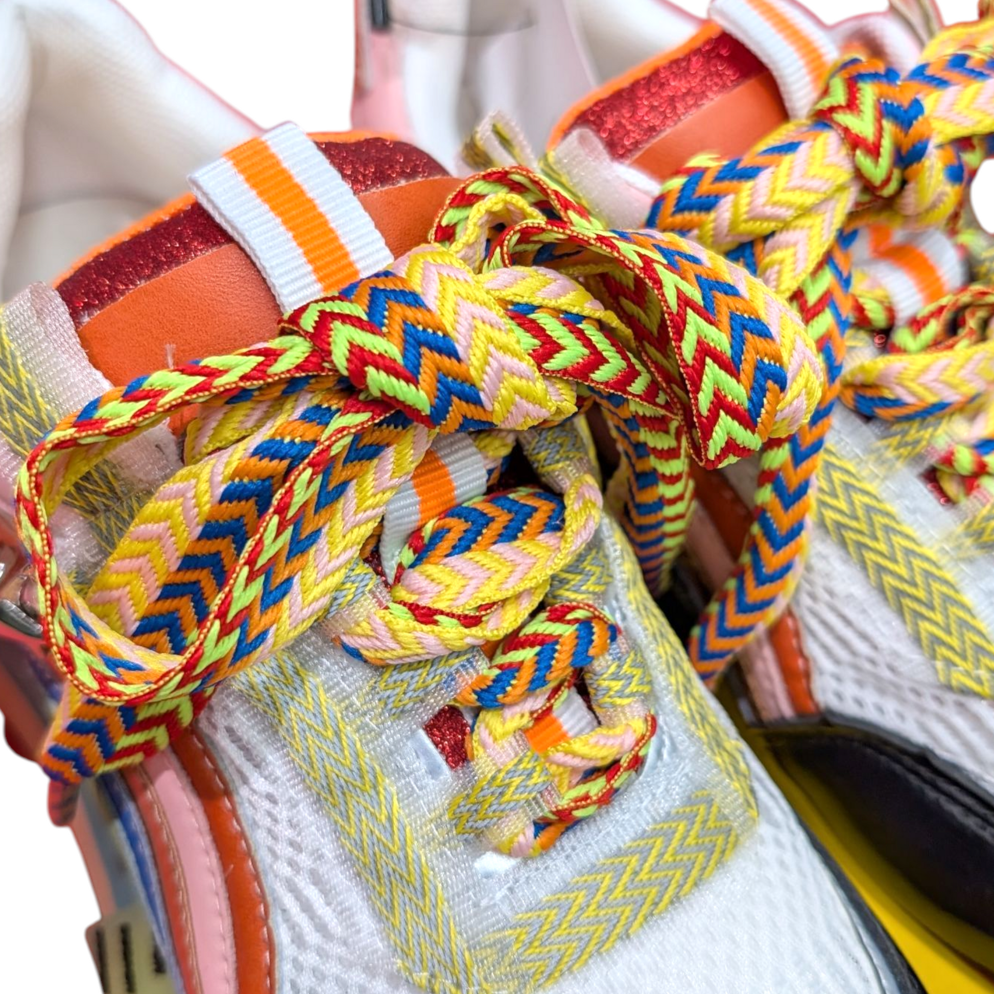 靴本体のカラフルデザインに加え、靴紐も3色の編み込みを合わせた華やかさです。