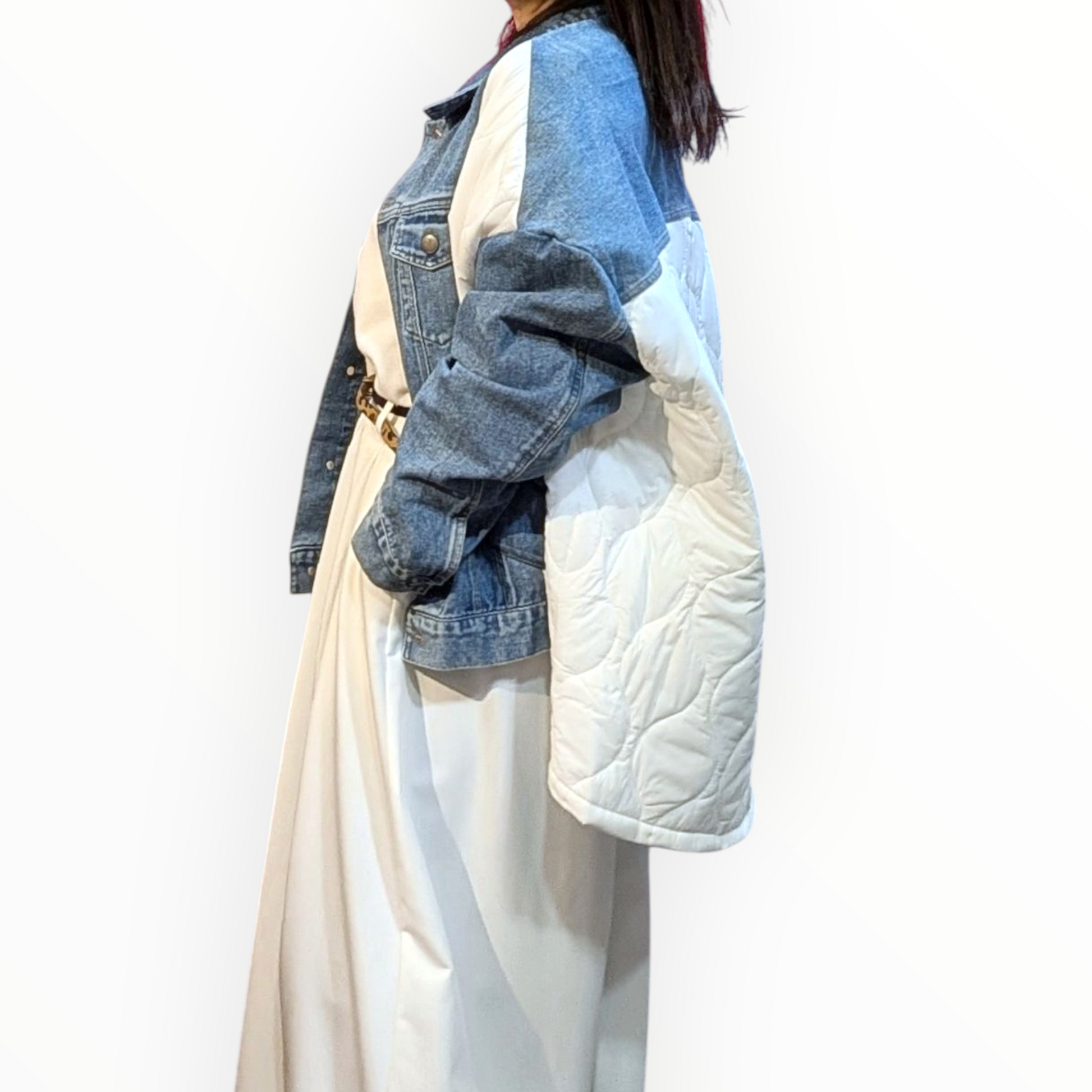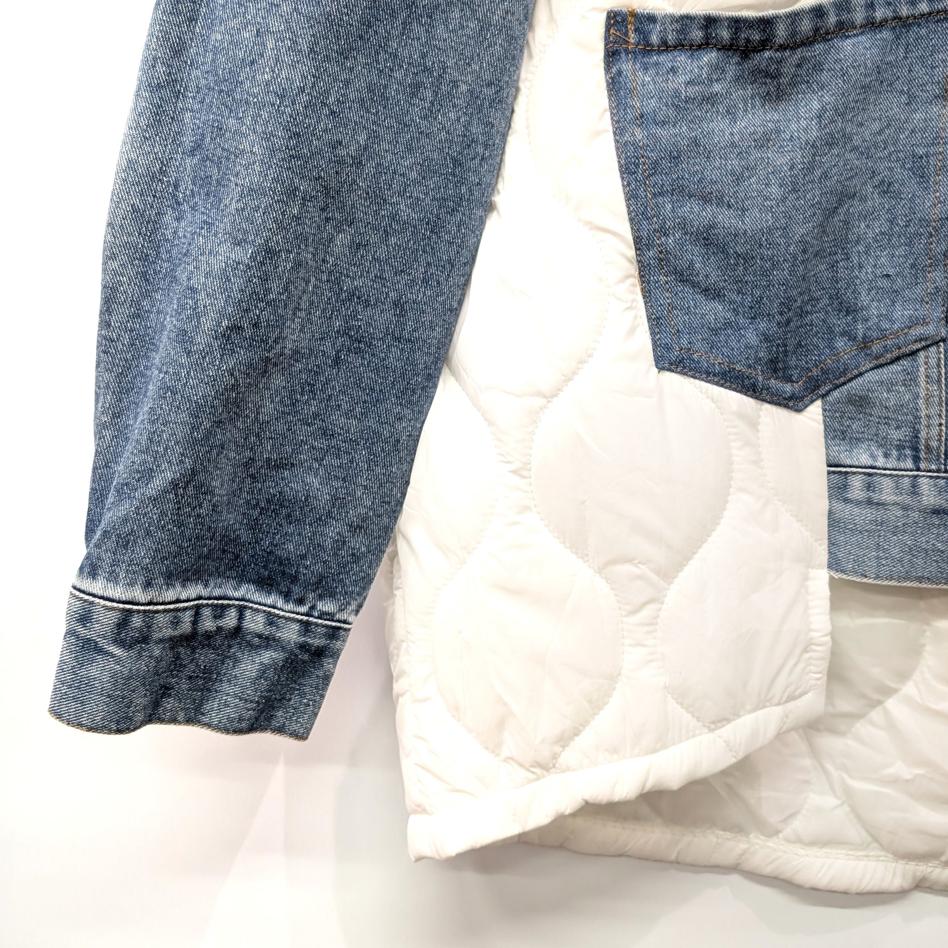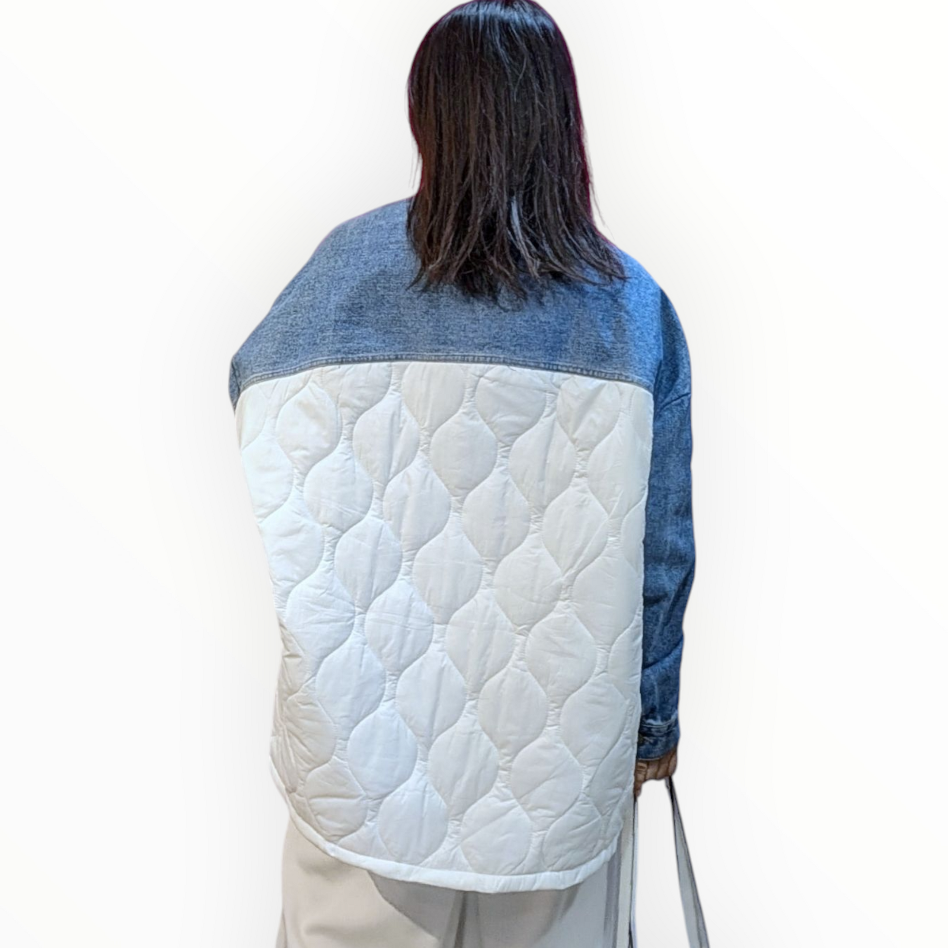 一見デニムベスト風にも見えるアウターはシーズンレスに汎用性がある白のキルティング切替えです。