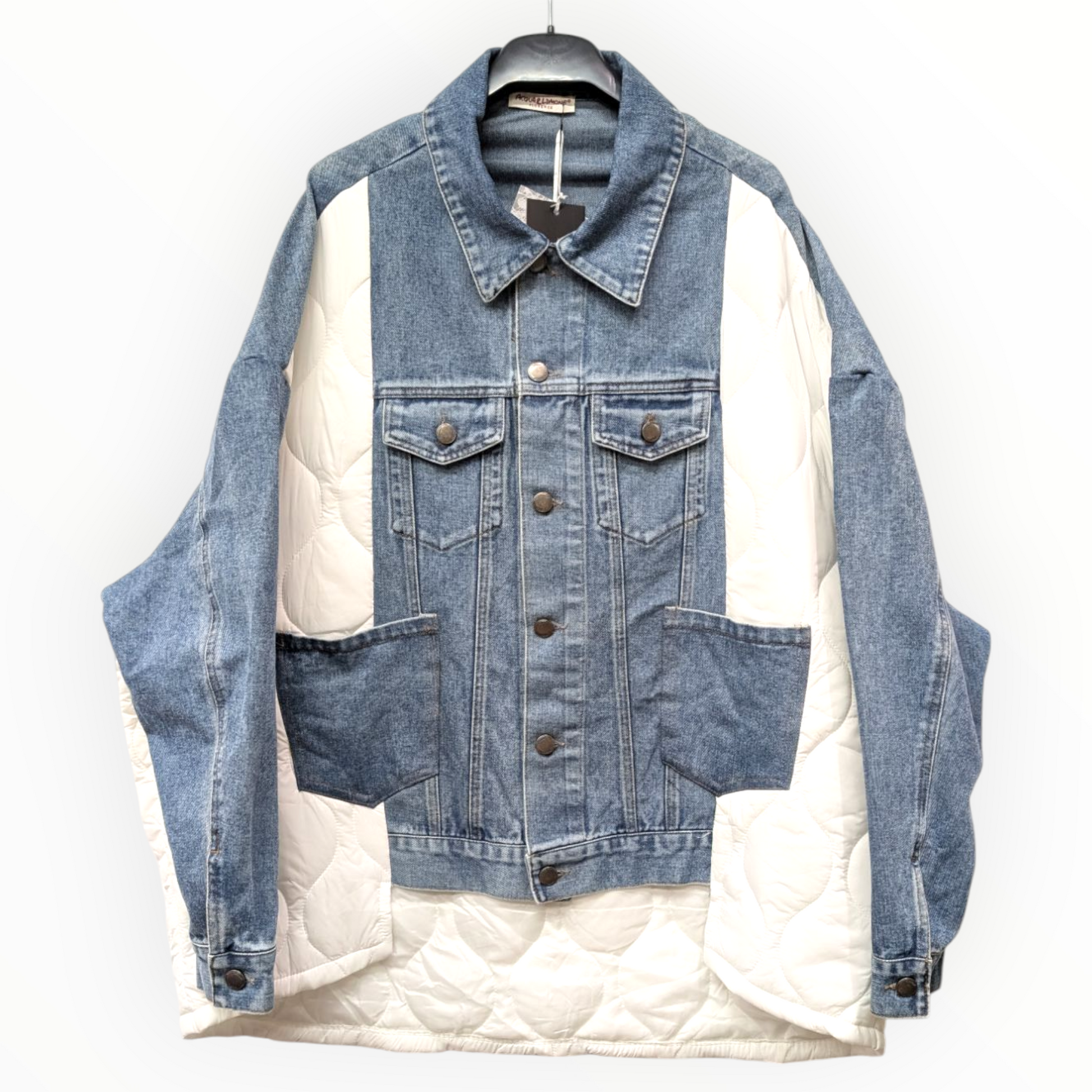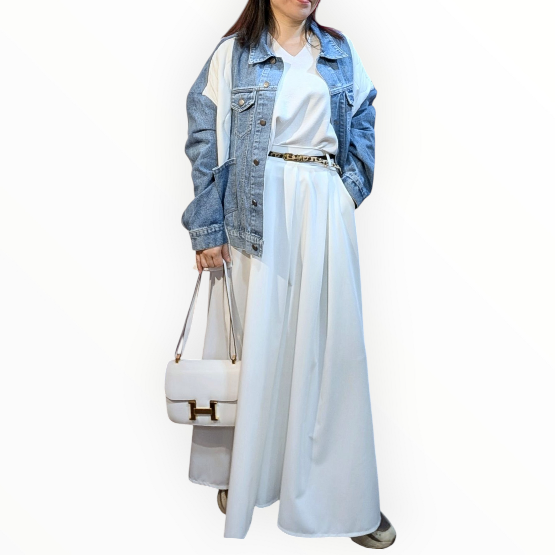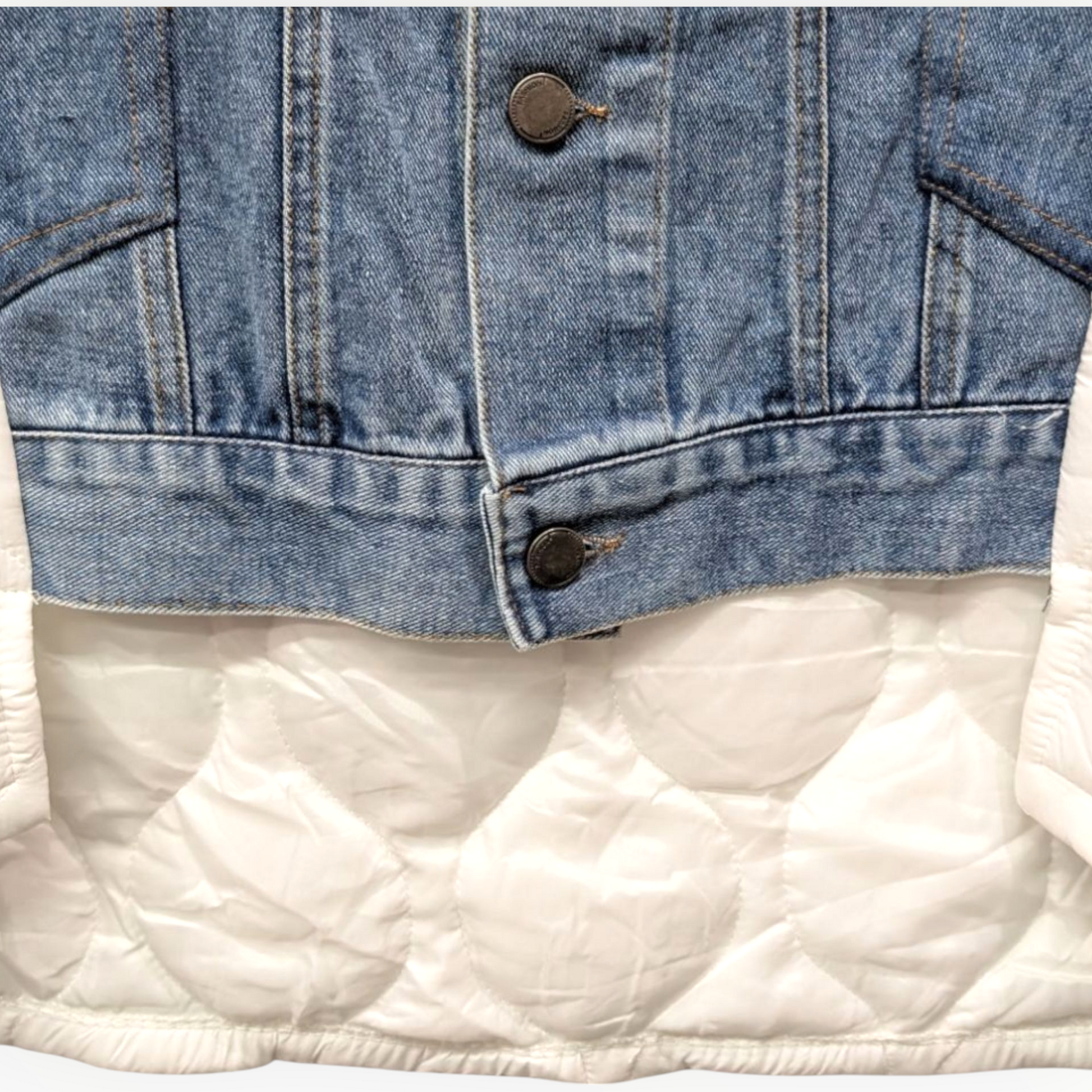 一見デニムベスト風にも見えるアウターはシーズンレスに汎用性がある白のキルティング切替えです。