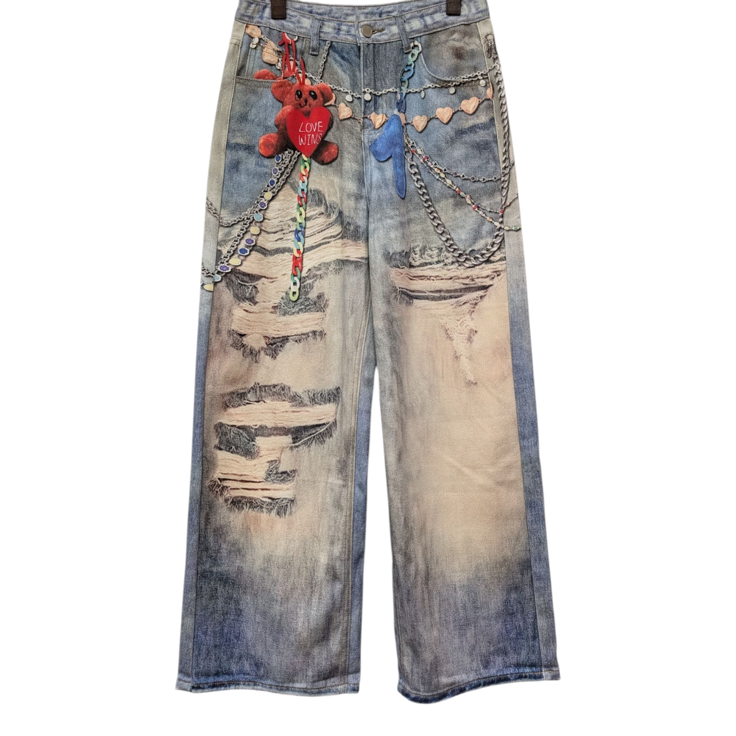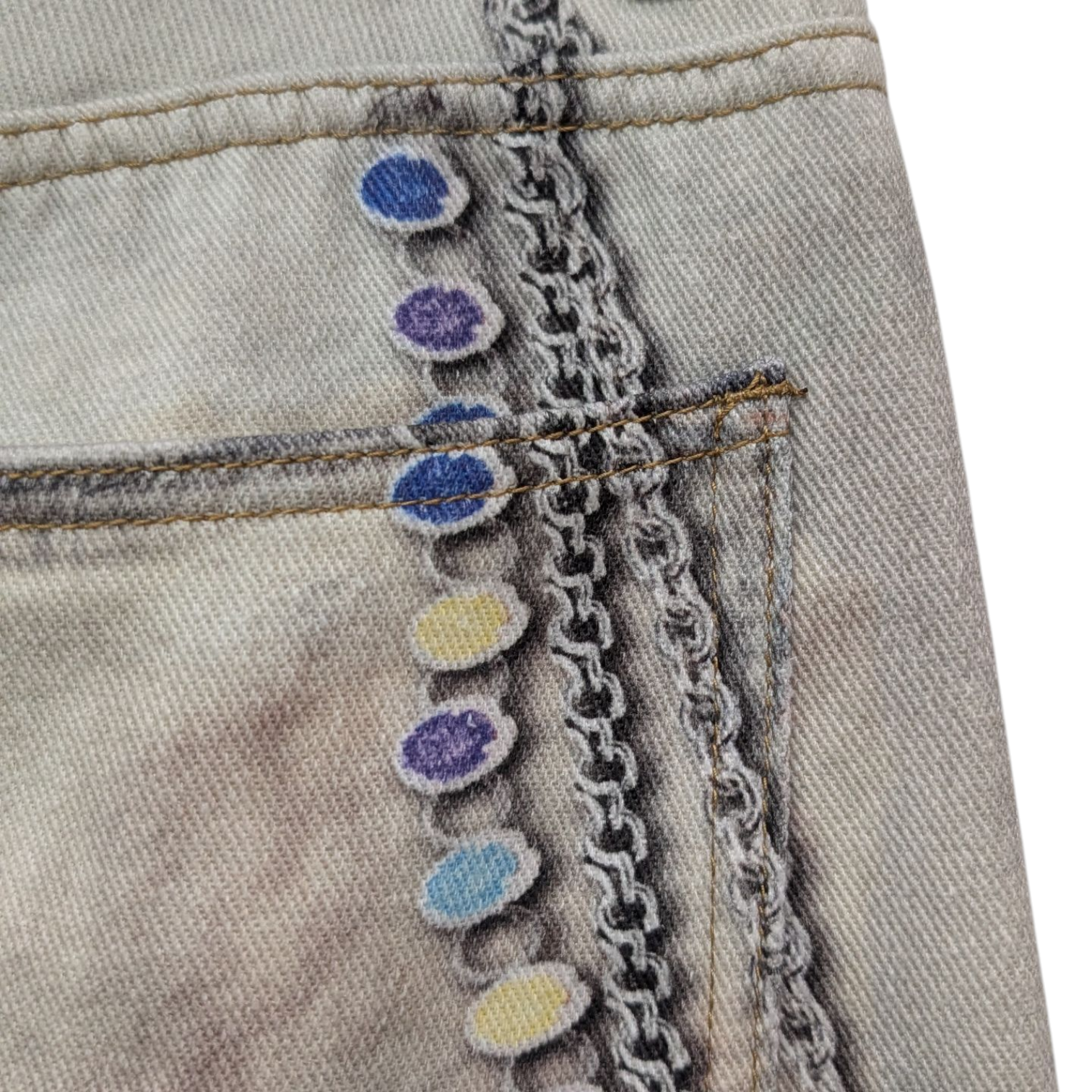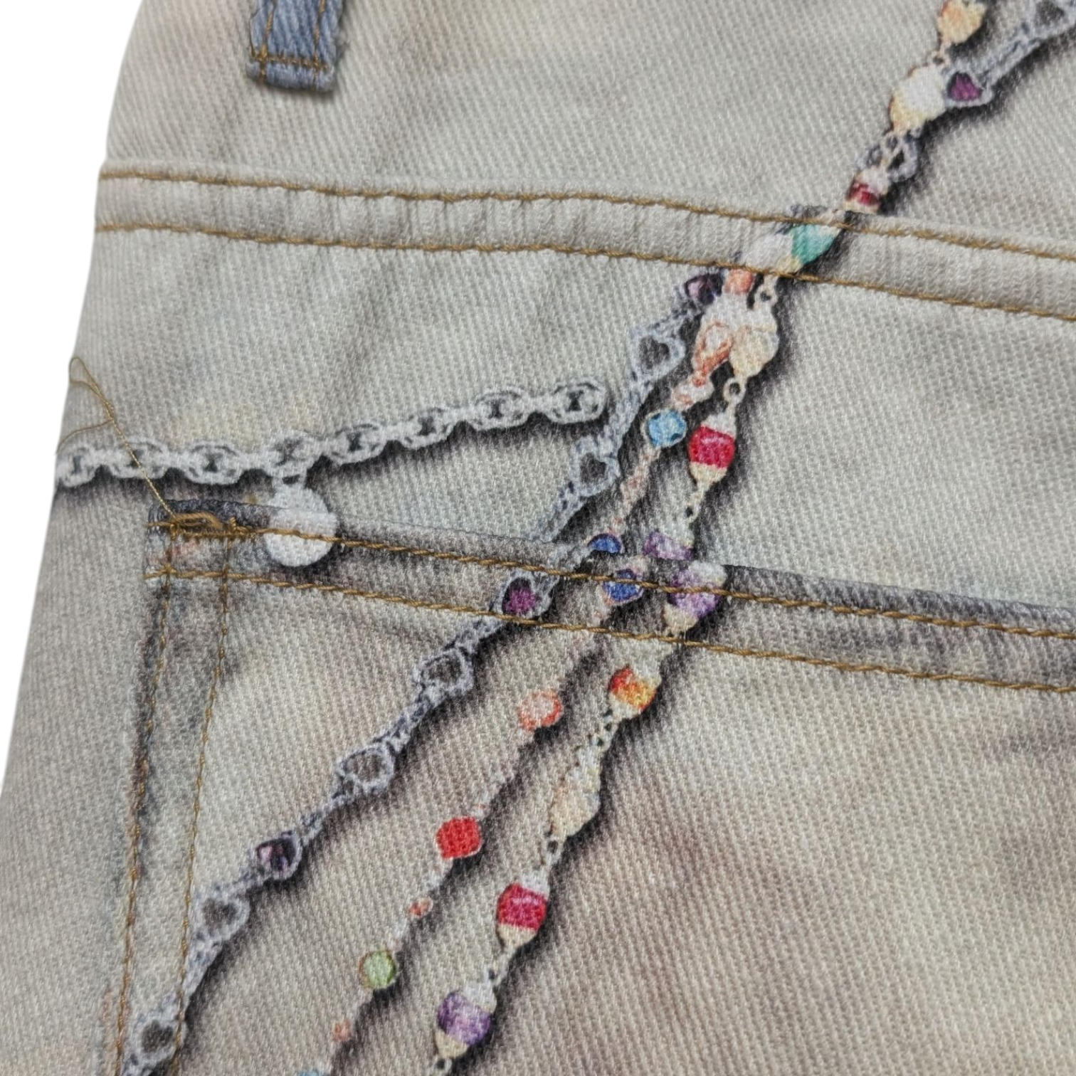 クマのチャームやストラップチェーンなどが付いているかのようなだまし絵プリントのデニムパンツです。