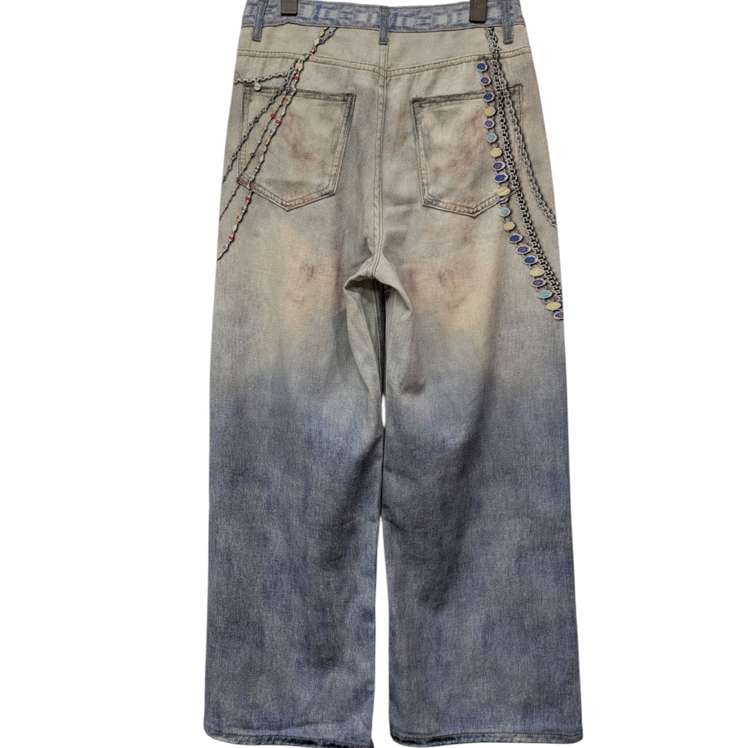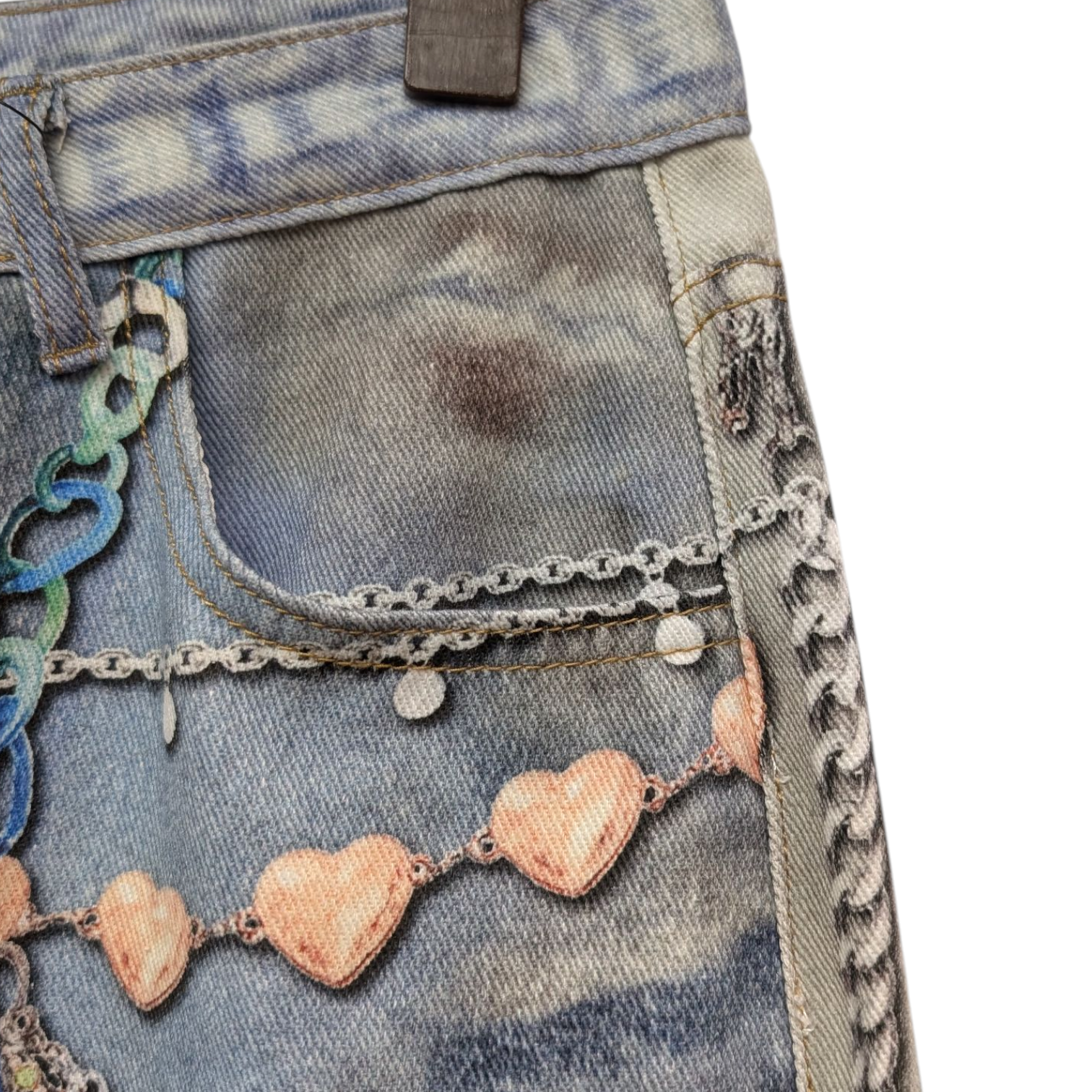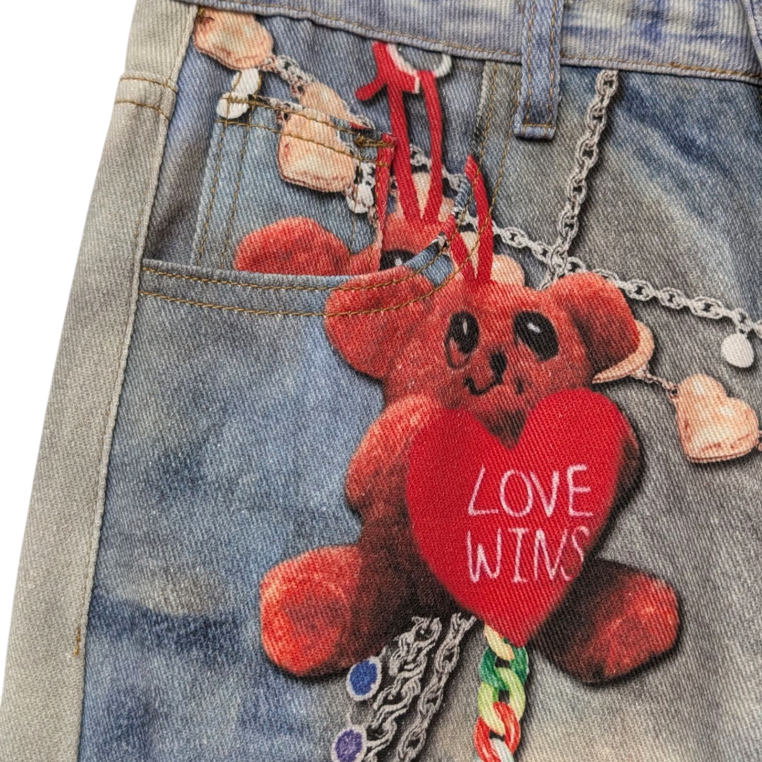 クマのチャームやストラップチェーンなどが付いているかのようなだまし絵プリントのデニムパンツです。
