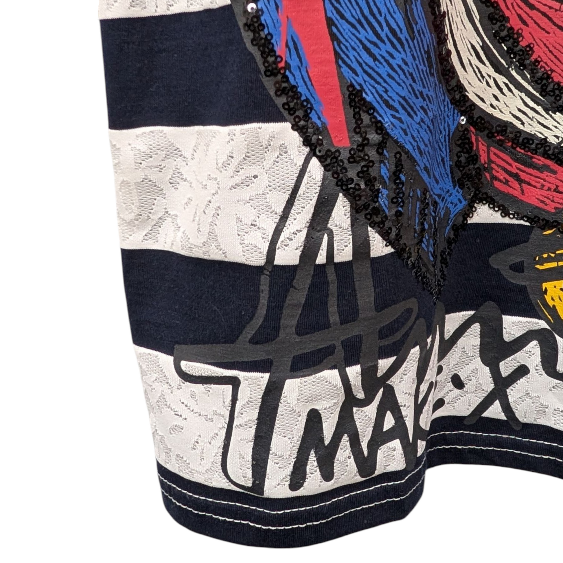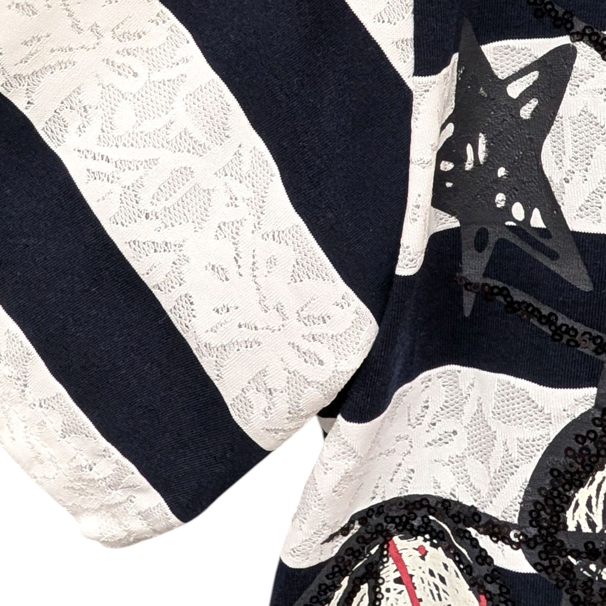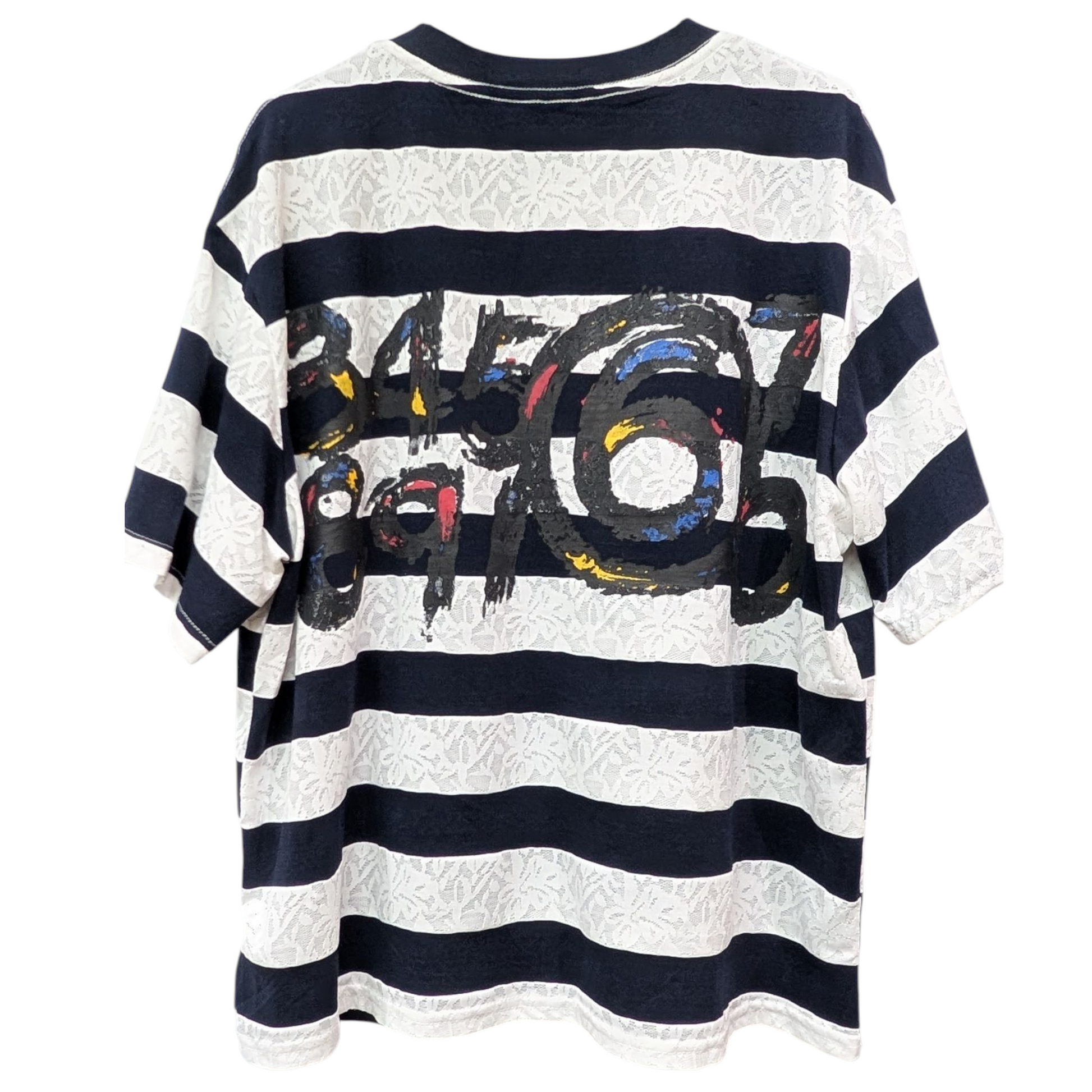 ネイビーと白レースのボーダーにドラえもんを大胆に描いたインパクトあるTシャツです。