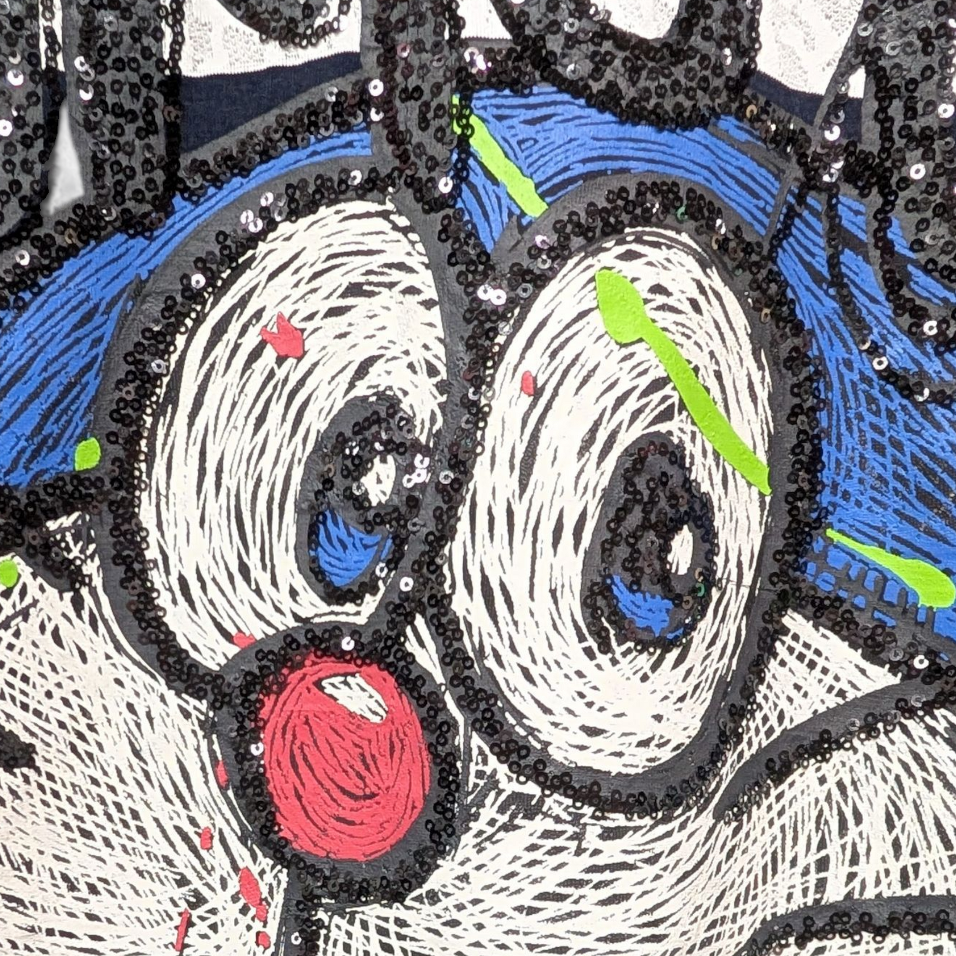 フロントの文字とドラえもんアウトラインにはとても細かい黒のスパンコールを縫い付けてあり、華やかな高級感もあります。