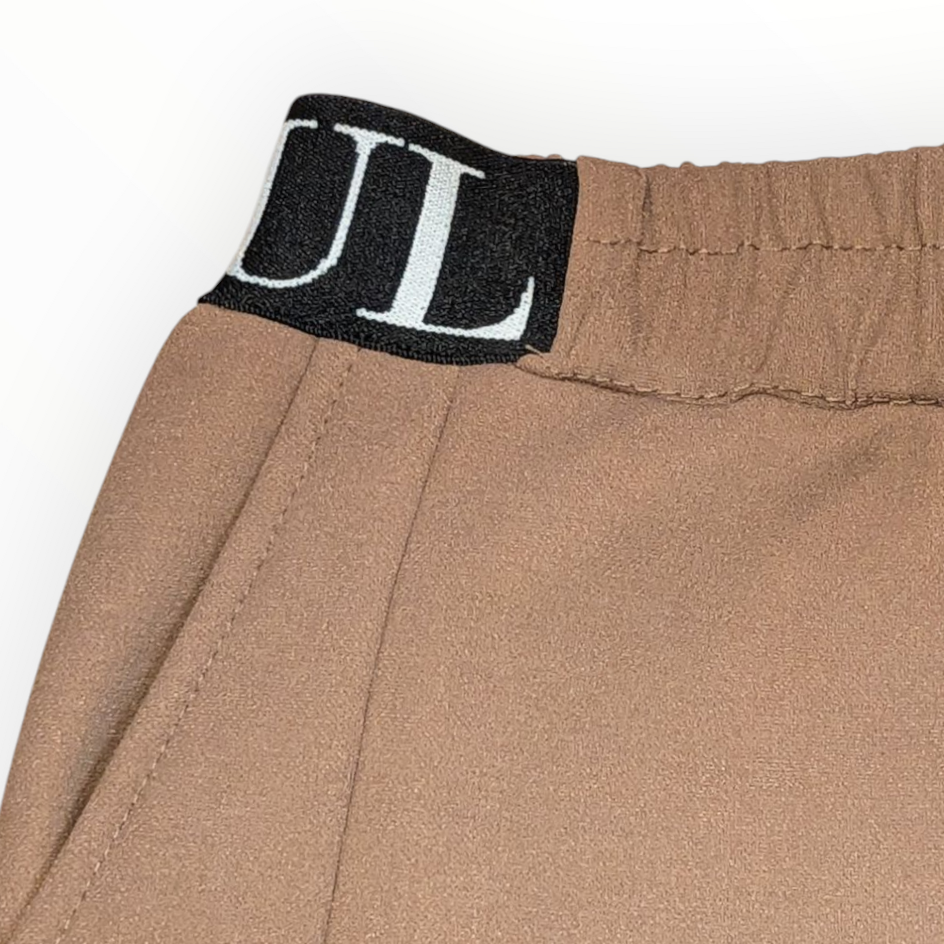 ウエストの両サイドにはロゴ入りの平ゴムをアクセントにしています。