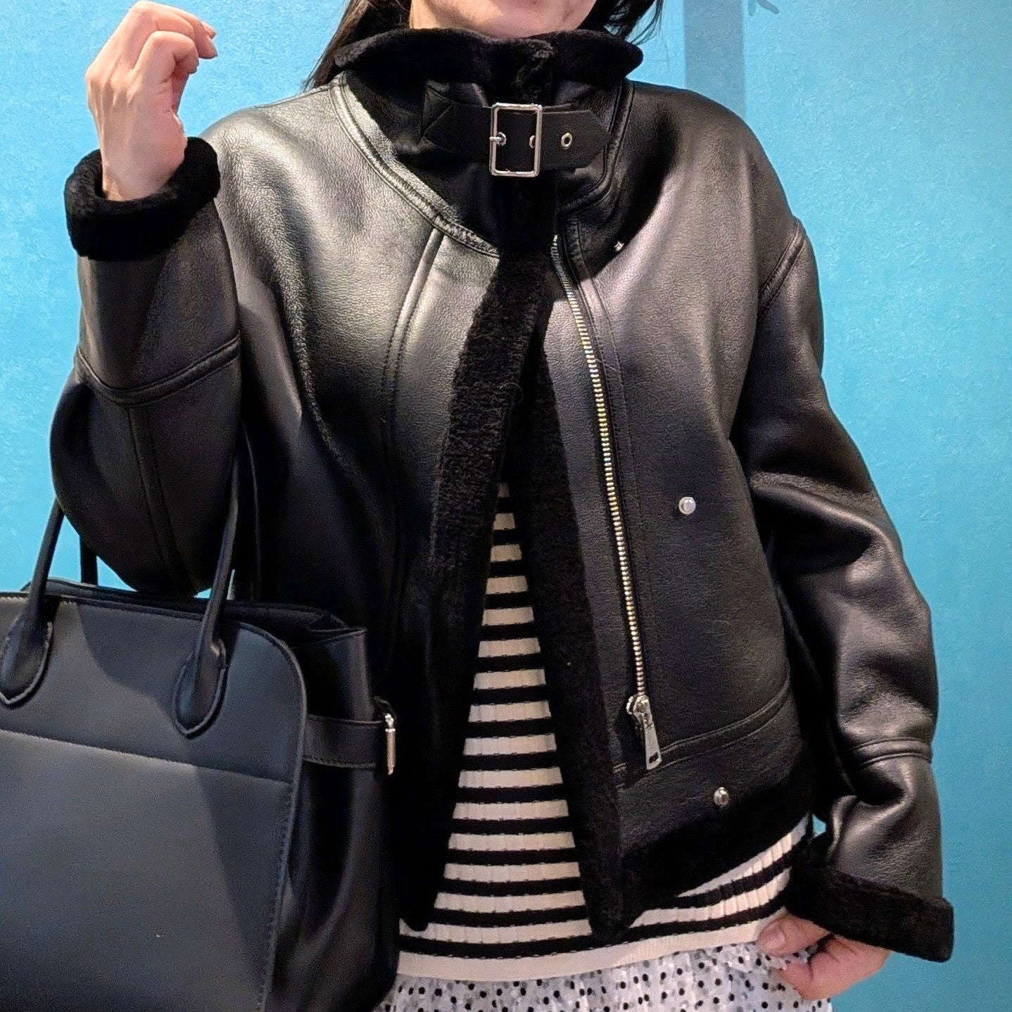 見た目よりとても軽くて暖かい女性らしい品のあるレザーブルゾンとなっています。