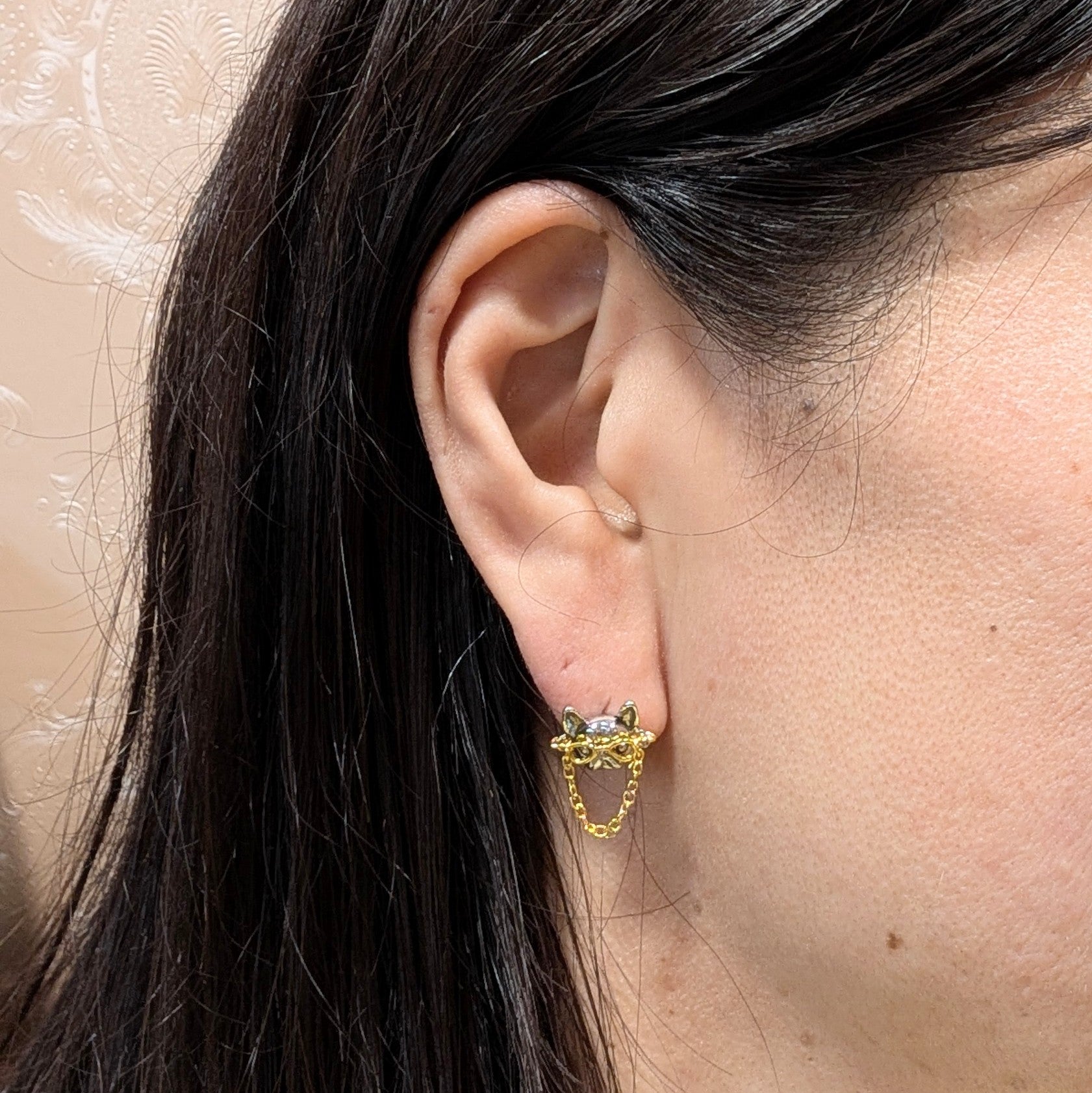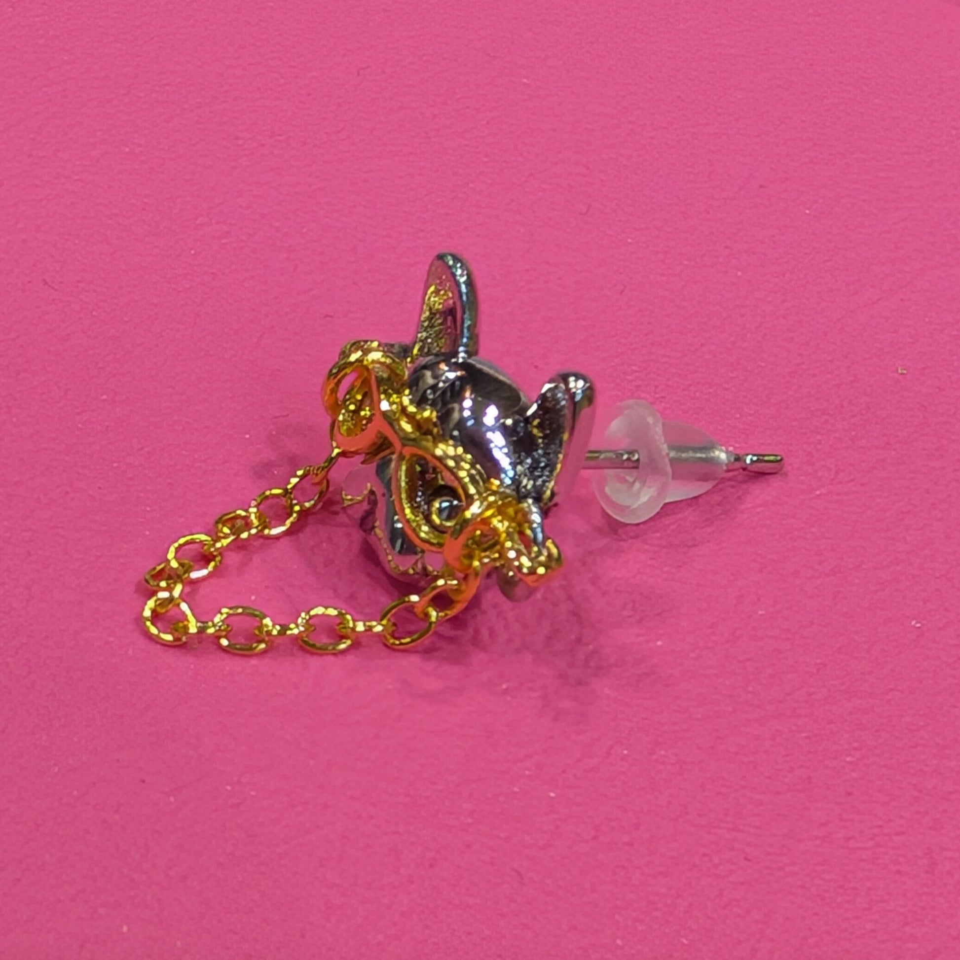 小さいモチーフながらインパクトがあり、チェーンが揺れるのでスタッズタイプなのに動きの出るピアスです。