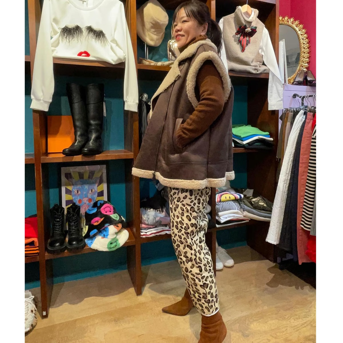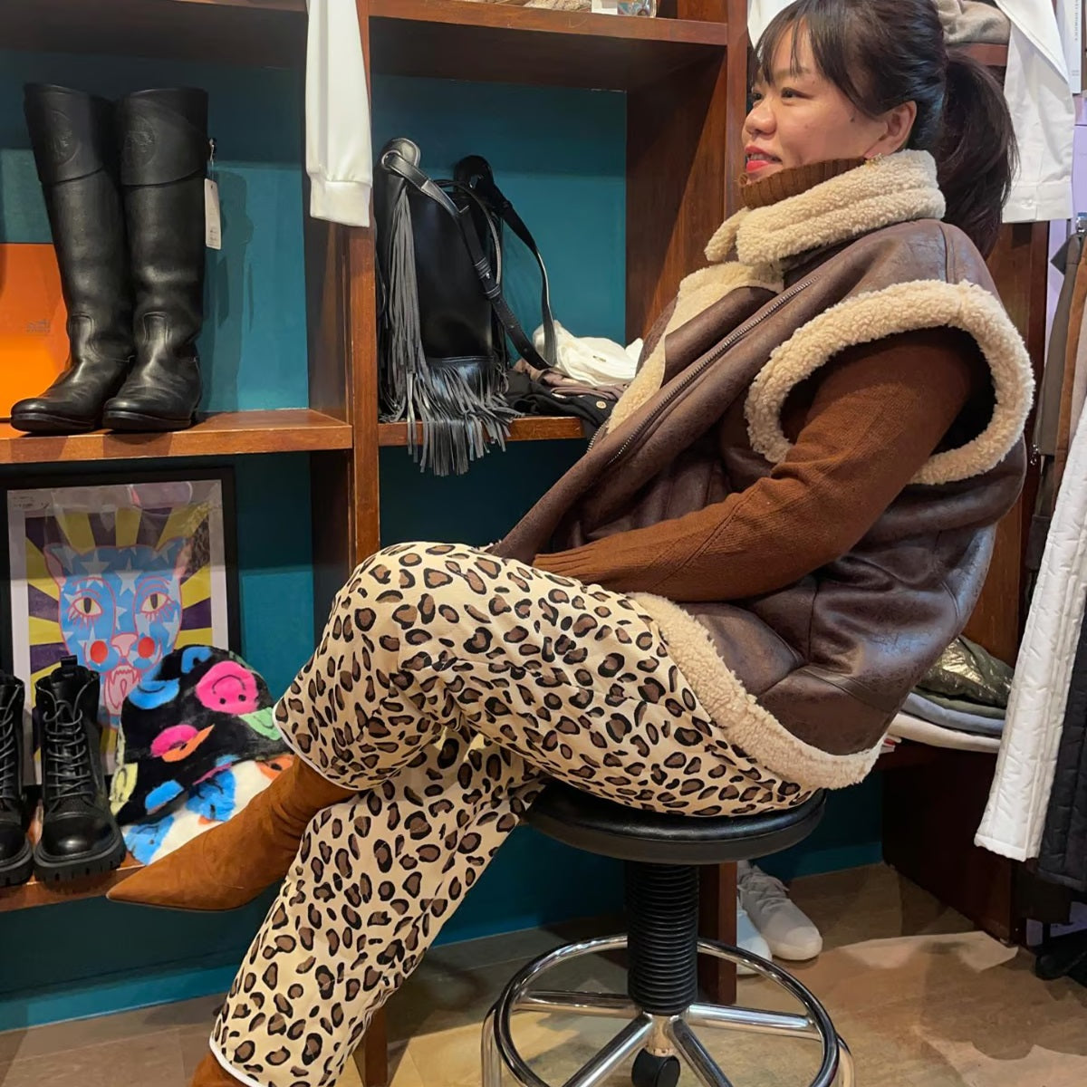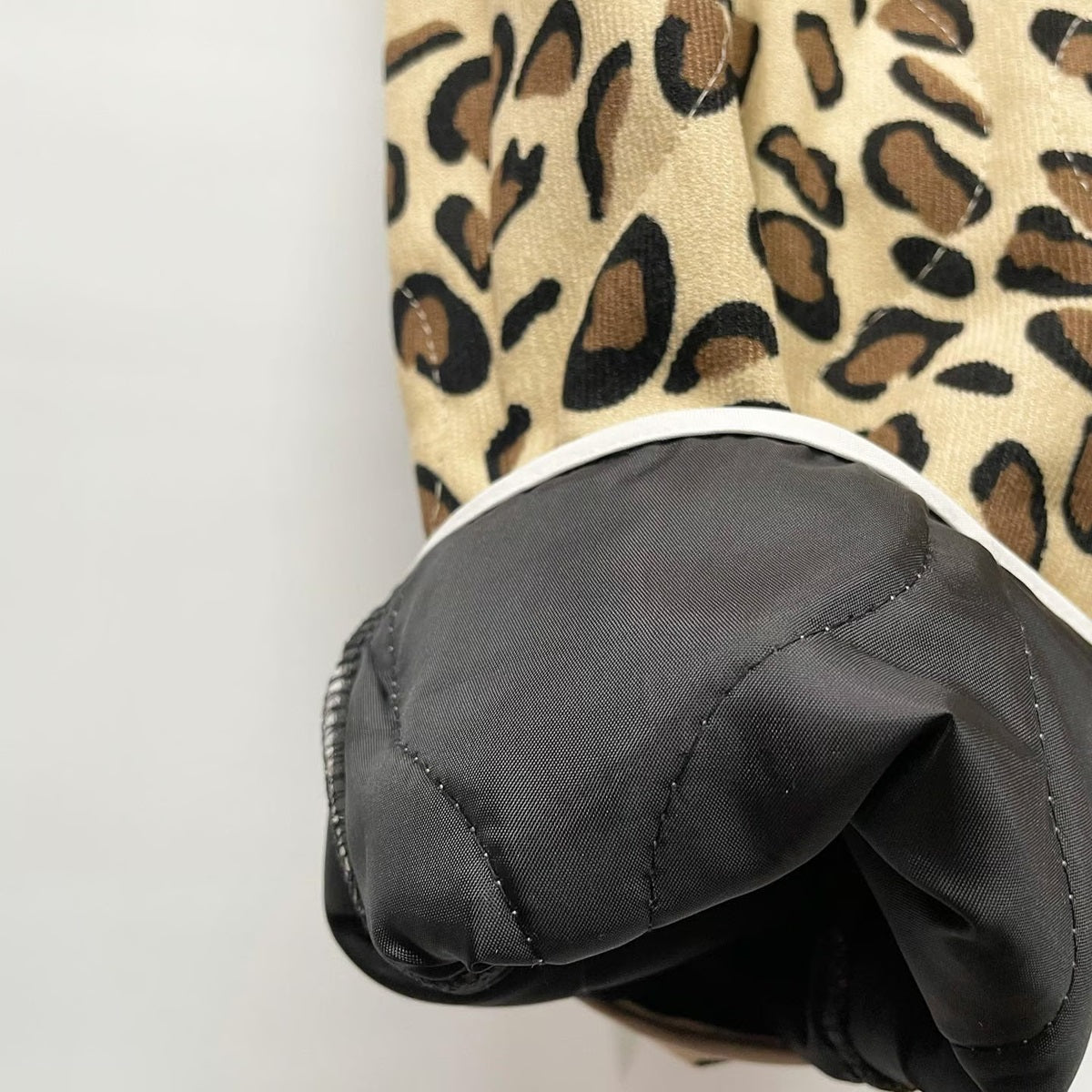 薄手の中綿が入ったレオパード柄のパンツ。