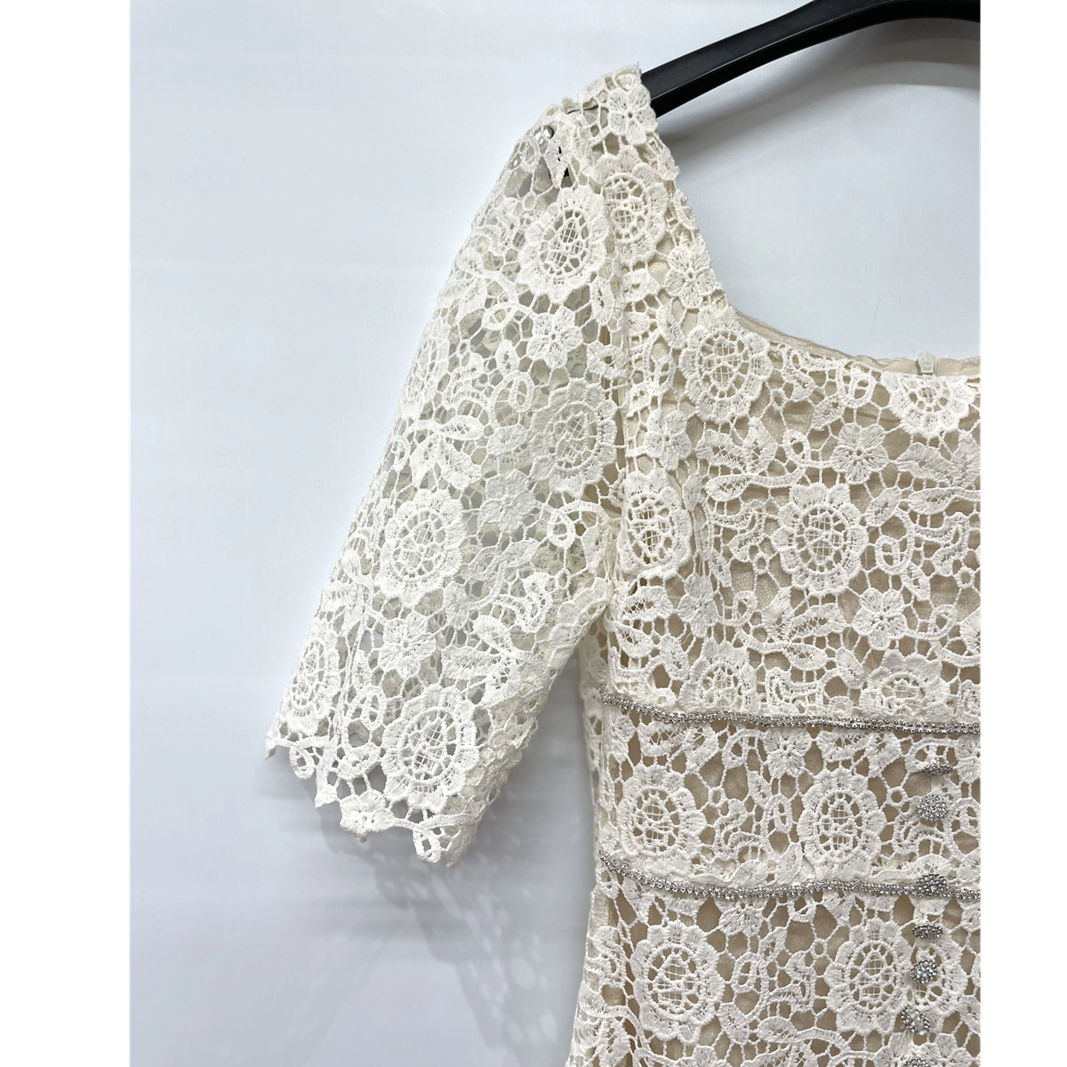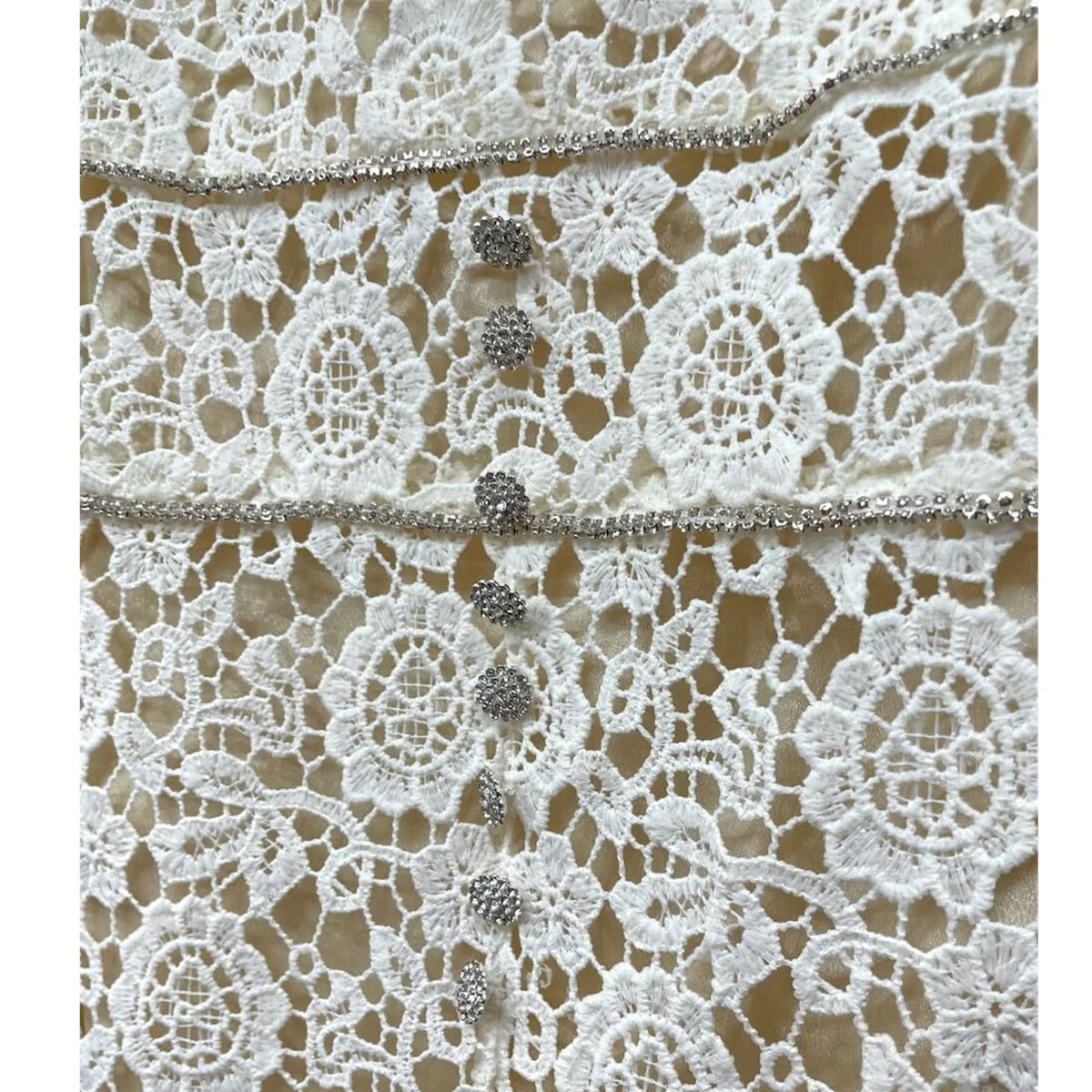 真っ白ではなく生成りのコットンレースが上品で、胸元にはシルバーのビジューボタンとトリミング付き。