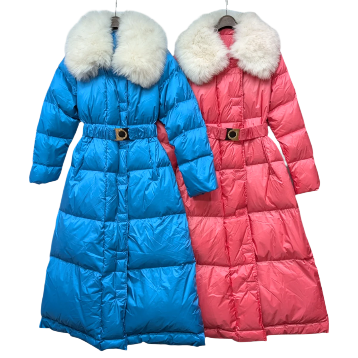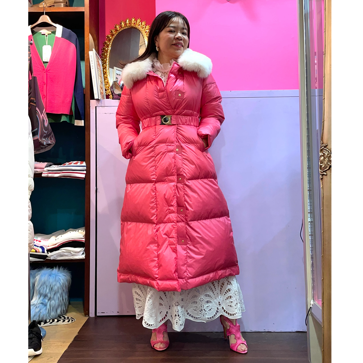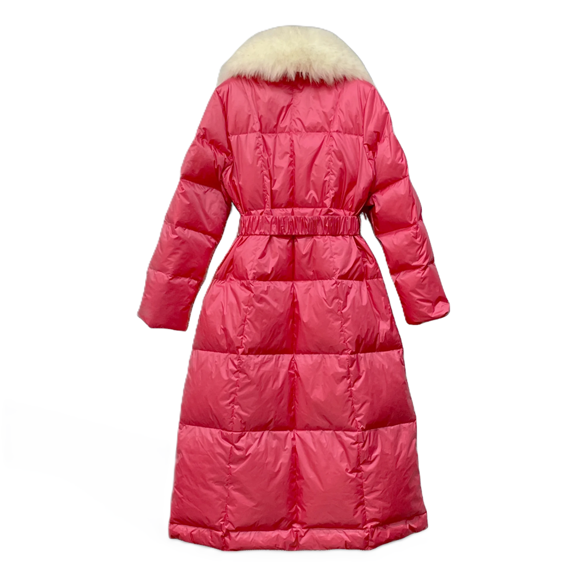 リアルダウンとフォックスファーを使ったドレッシーなマキシ丈ダウンコート。