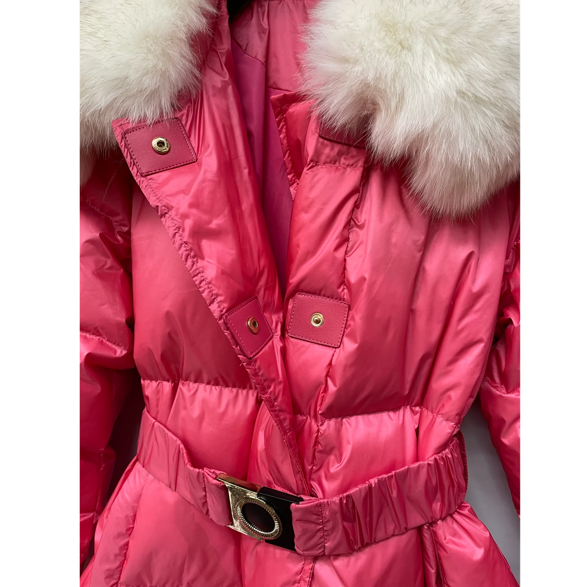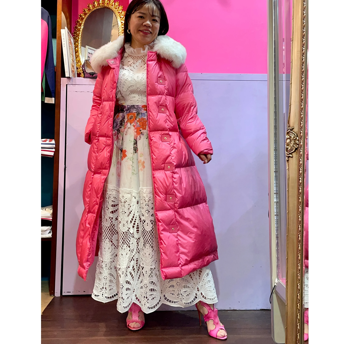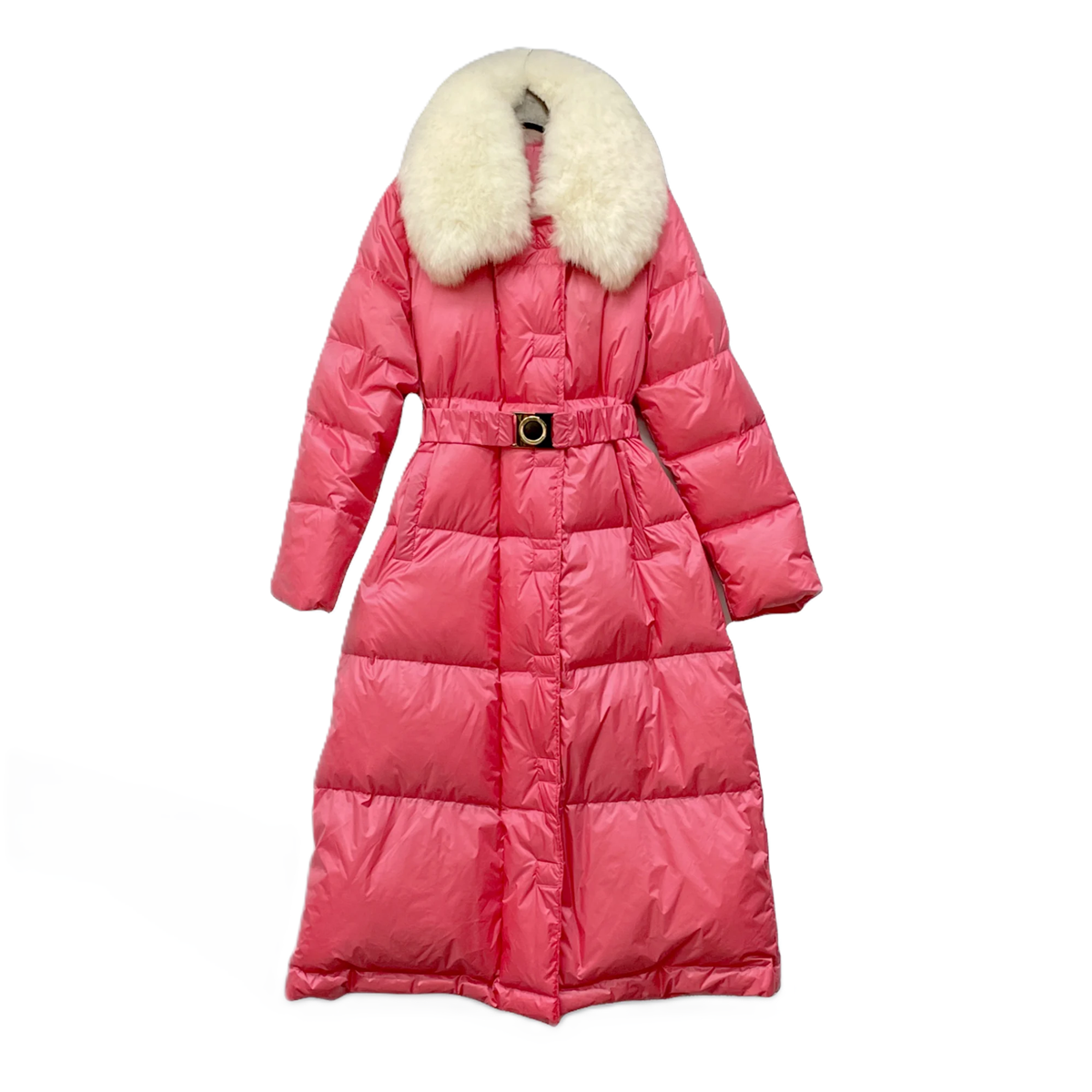リアルダウンとフォックスファーを使ったドレッシーなマキシ丈ダウンコート。